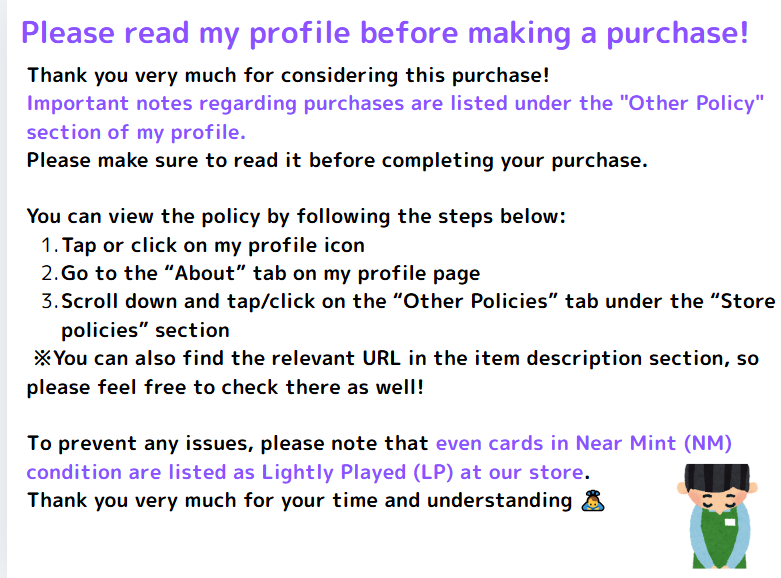 - Please make sure to read the "Other Policy" section in my profile before making a purchase.